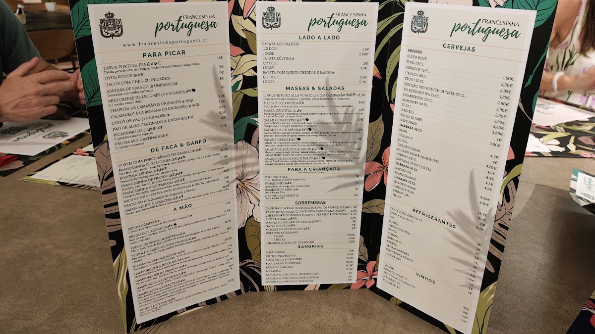The menu at Francesinha Portuguesa offers a delightful array of hearty, traditional Portuguese dishes, with a strong emphasis on the iconic Francesinha à Portuguesa. This dish stands as the star of the menu, bringing together layers of meat, cheese, and a rich, spicy sauce, making it a must-try for anyone visiting the restaurant. For those seeking variety, there’s the Prego dos Açores, a flavorful Portuguese steak sandwich, and the Hamburguer Há Portuguesa, a delicious twist on the classic burger with a Portuguese flair. Vegetarians can also enjoy a satisfying option with the Francesinha Vegetariana, which maintains the same savory taste but with plant-based ingredients. If you're looking for something lighter, the Prego No Pão is a simple yet tasty choice of steak in a sandwich, offering a comforting and satisfying bite. To accompany your meal, the refreshing Sangria de Hortelã adds a touch of mint to the traditional sangria, perfect for those looking to enjoy a drink with a unique flavor. With a menu that beautifully highlights Portuguese flavors, Francesinha Portuguesa presents a great variety of dishes that cater to all tastes, making it an excellent choice for any meal.